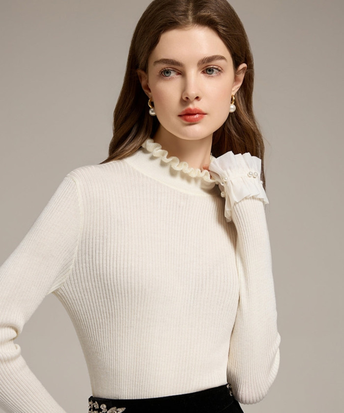 袖のレースと首元のフリルが、白ニットに“ちょうどいい甘さ”を添えてくれる一枚。ハイネック仕様で防寒性もありながら、フリルのプリーツ調で華やぎもプラス。白×ハイネックの組み合わせが顔まわりを明るく見せ、初雪の日のロマンティックな雰囲気にもぴったりです。スカートやデニムどちらにも合わせやすく、写真にも映える“特別感ある日常服”として活躍します。