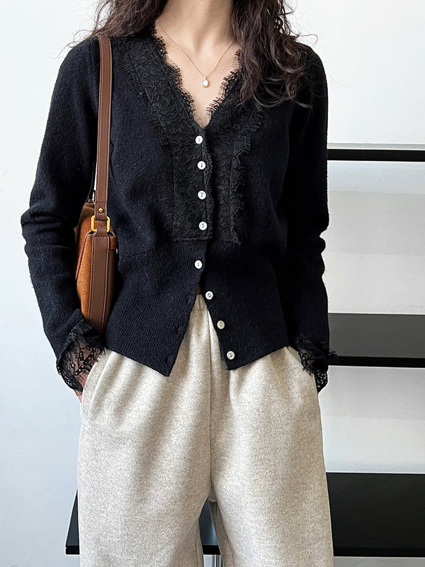 深めのVネックが美しいブラックニットカーディガンに、繊細なレースのネックラインが女性らしさをプラス。シンプルながら華やかさを感じさせるデザインで、上品なきれいめスタイルを叶える一着です。スウェットパンツを合わせたコーデでオシャレ上級者に。