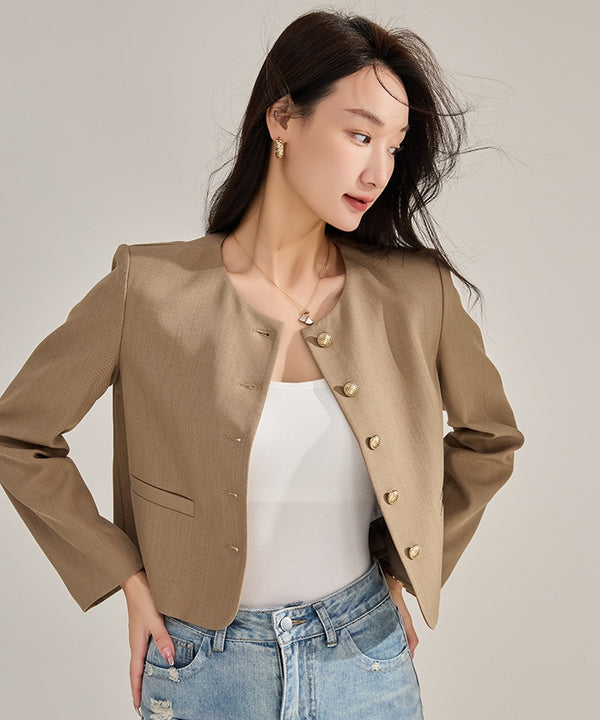 ゴールドボタン付きノーカラーショートジャケットは、きれいめでかっちりした印象を与えつつ、デニムパンツを合わせることでカジュアルダウン可能。上品さを保ちつつラフさも加わり、大人女性にぴったりの万能アイテムです。