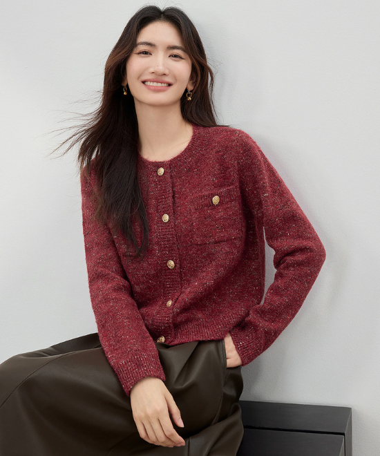レッドカラーのフローラルヤーンニットカーディガンは、秋冬にぴったりの華やかさが魅力。ラウンドネックで柔らかい印象を与えつつ、落ち着いた秋色ボトムスと合わせることで、季節感あふれる大人可愛いスタイルが完成します。