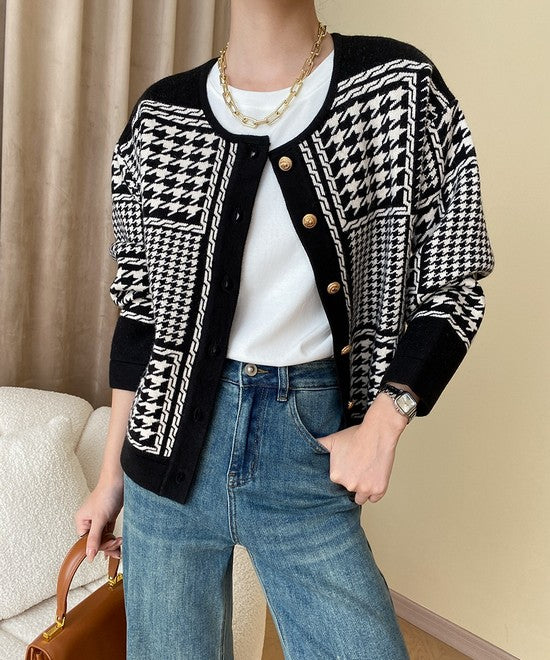 ラウンドネックの柄ニットカーディガンは、トップスとしても羽織としても使える万能アイテム。モノトーン配色でデニムパンツと合わせれば、カジュアルながらも洗練された印象に。コーデの主役になるデザインで秋冬のデイリーコーデにぴったりです。