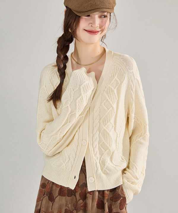 Vネックのベージュケーブルニットカーディガンは、柔らかなカラーと上品な編み目が特徴。デイリー使いからお出かけまで幅広く活躍し、落ち着いた大人可愛い印象を与えます。着回し力も高く、季節の変わり目に一枚あると便利なアイテムです。