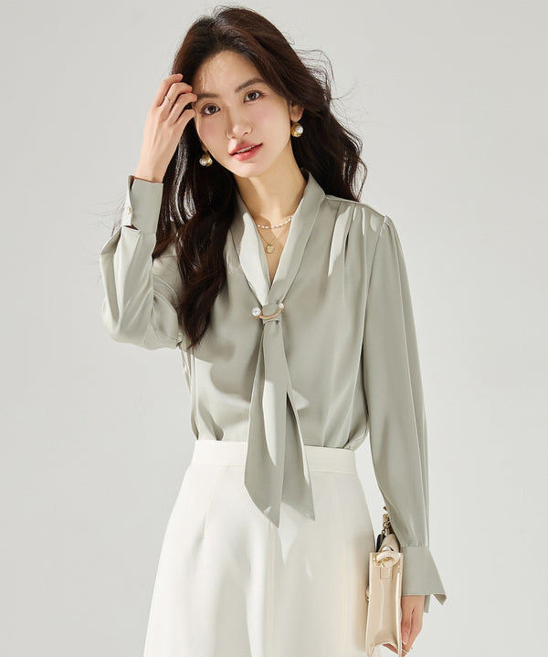 華やかなグリーンカラーのサテンボウタイブラウスは、パールボタンのアクセントで上品さも演出。顔まわりを明るく見せながら、パンツやスカートに合わせて大人の女性らしい洗練スタイルを楽しめます。オフィスから休日のお出かけまで活躍するアイテムです。