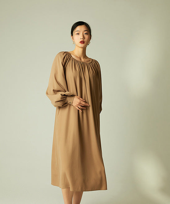 胸元にギャザーを施したドレープロングワンピースは、ふんわりとしたシルエットが魅力の一枚。ゆったりした着心地でリラックス感がありながら、大人らしい上品さも演出。一枚で存在感のある着こなしが叶い、デイリーやお出かけまで幅広く活躍します。