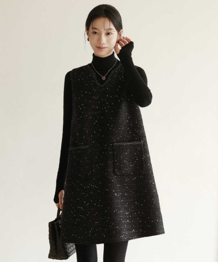 上品でありながら遊び心のあるギャラクシーウールのワンピース。ミニ丈Aラインのキュートなシルエットも、高級感のあるしっかりめ素材で大人きれいに着こなせます。