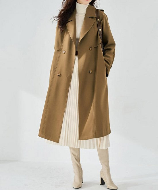 ブラックのダブルブレストロングコートは、ホワイトのアイテムにさっと羽織るだけでモノトーンのシックな大人コーデが完成。シンプルながらも洗練された印象を与え、オンオフ問わずに着回しできるのが魅力です。