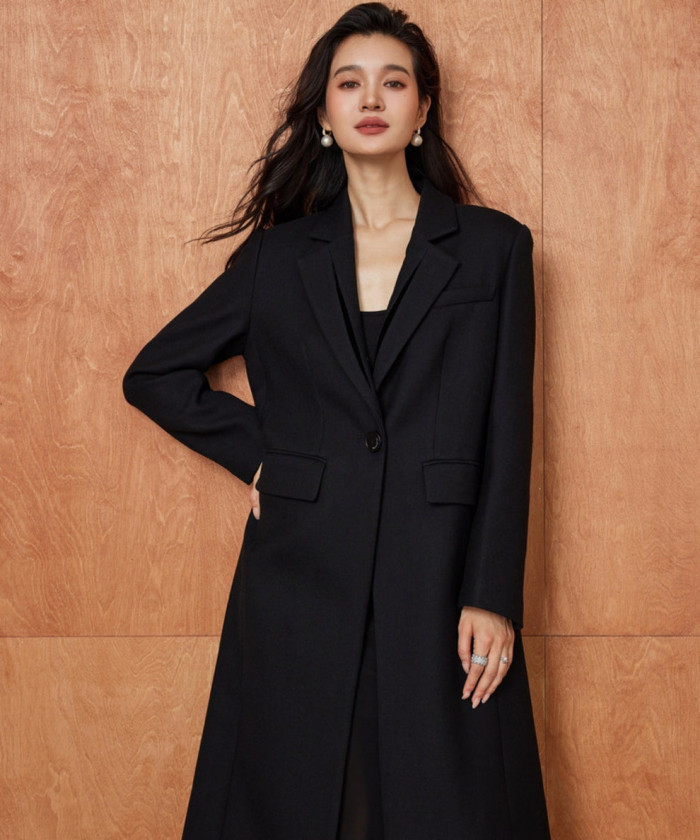 一枚羽織るだけでシルエットが引き締まり、品よく整うロングジャケット。ワンボタンのミニマルなデザインが清潔感を際立たせ、保護者面談の場面にも最適です。長め丈が自然に体型をカバーしつつ、インナーに薄手ニットを合わせるだけで快適&軽やかな防寒が叶います。