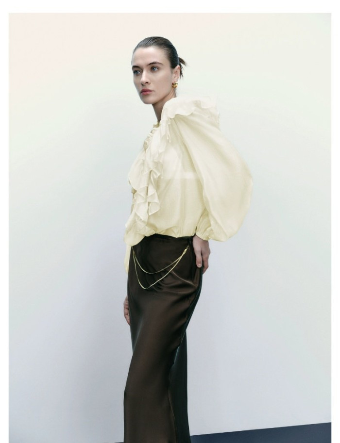 一見シンプルなトップスは、バックスタイルで他人と差が出るデザイン。さりげない肌見せが上品で、下着のラインは隠れる仕様なので安心。ボトムスにはワイドパンツを合わせて、ハンサムなモードコーデの完成。