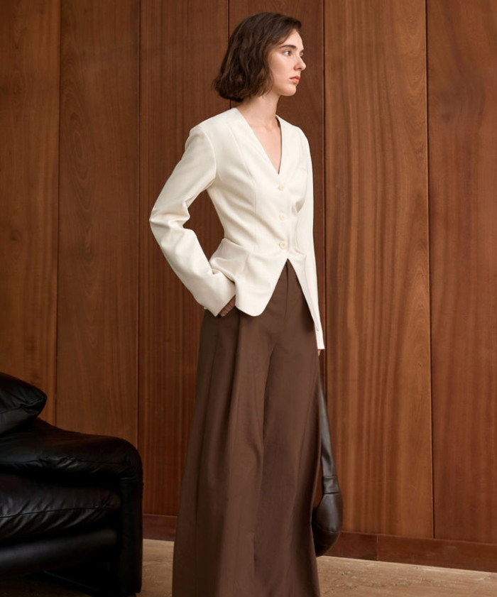 ウエストシェイプされたメリハリシルエットのノーカラージャケット。