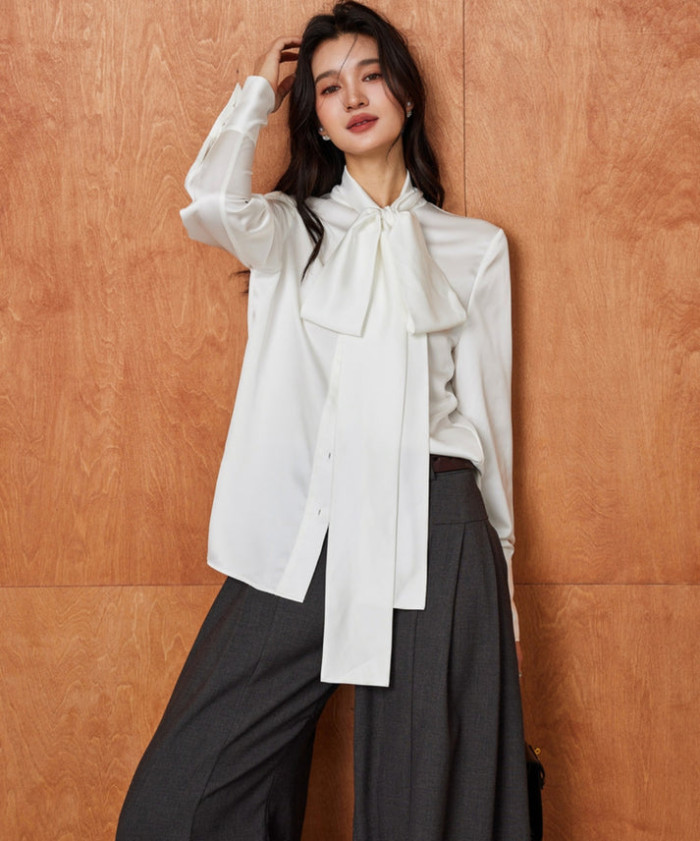 幅が広くて長いボウと、長めのカフスでモードな印象のボウタイシャツ。