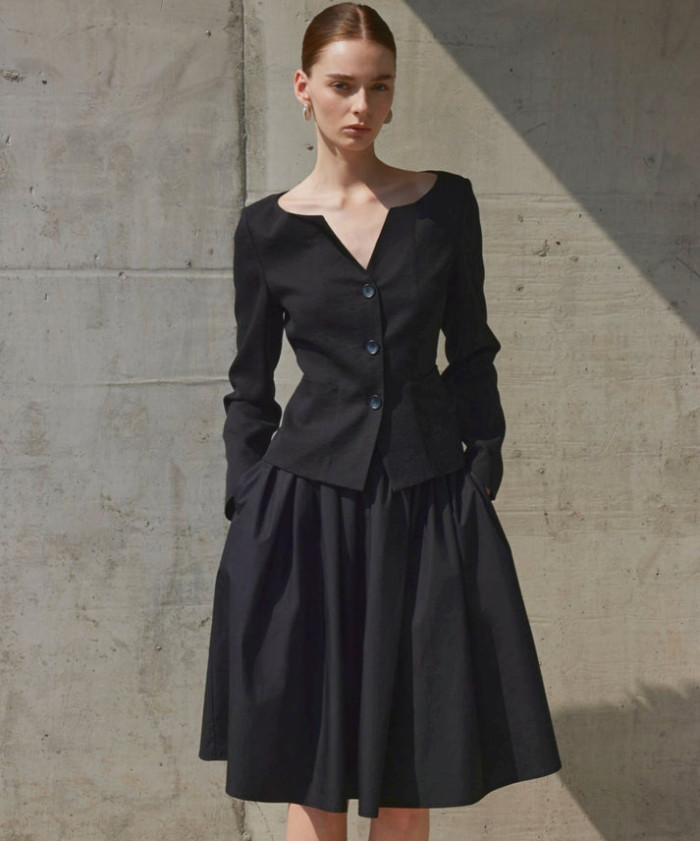 ボートネック×キーネックでデコルテを美しく見せてくれるジャケット。