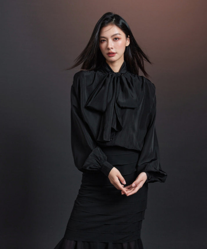 肩のラインに前側だけギャザーを入れ、パフスリーブと共にボリュームを演出したボウタイブラウス。落ち感があってエレガントな印象です。