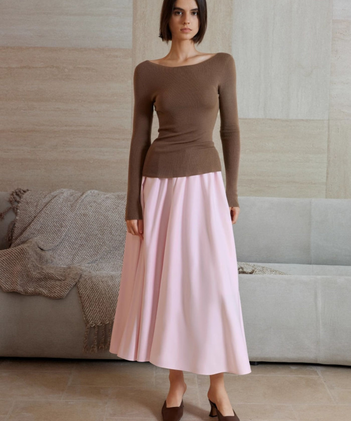 ブラウン×ピンクのロマンチックな配色。ボトムスでピンクを取り入れることで、甘さを抑えつつ、シーンを選ばない優雅な雰囲気に。落ち着きと女性らしさを両立した、特別な日にもおすすめの大人コーデです。