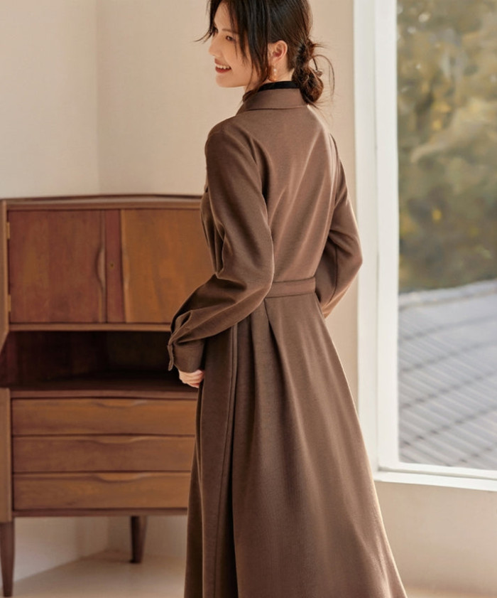 ハイネックとシャツのレイヤードスタイルみたいなシャツワンピース。バックルまで同素材のベルトがおしゃれですね。
