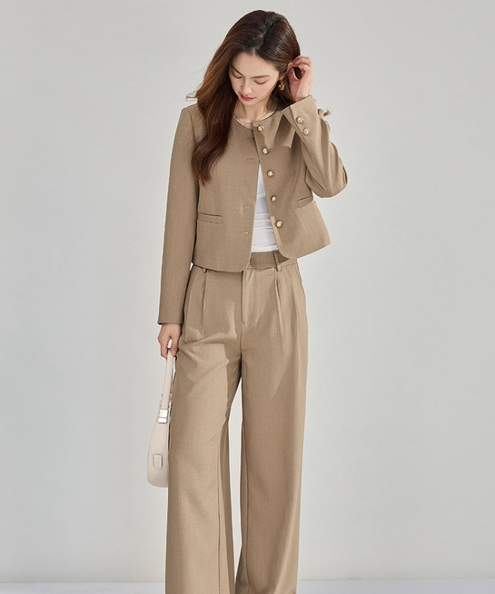 ノーカラーの襟デザインがすっきりとした印象で着用することのできる、ノーカラージャケット。柔らかな雰囲気のあるベージュカラーをベースに、ゴールドボタンが綺麗に映え、大人っぽい品格が溢れますよね。セットアップ風に同じ色味のストレートパンツを合わせれば、さらに品格溢れる印象になります。