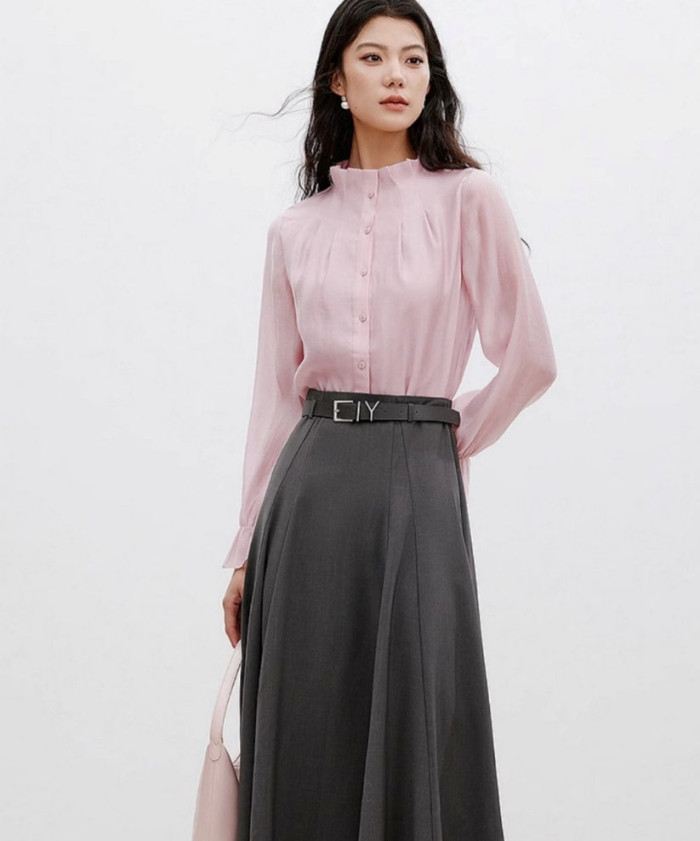 フリルのディテールデザインがスウィーティーで可愛らしいですが、一部にしかデザインされていないので着用しやすいフリルブラウス。きちんと感があるので、ビジネスシーンでもプライベートシーンでも着回すことができます。薄手のトップスなので、上から厚手のアウターも着用しやすいですよ。