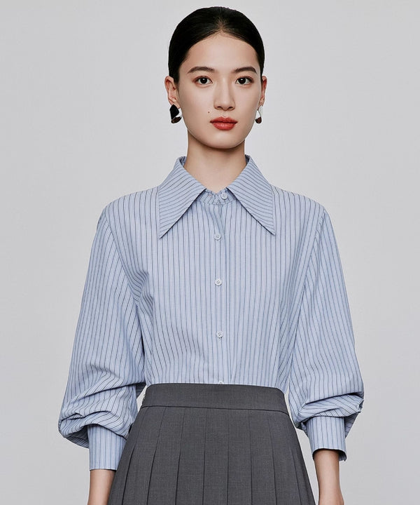 ワイドカラーのブルーストライプシャツは、きれいめにもカジュアルにも着こなせる万能アイテム。ニットのインナーとしてレイヤードすれば、さりげなくアクセントを加えつつ、こなれ感のあるスタイルに仕上がります。爽やかさと上品さを両立できる一枚です。