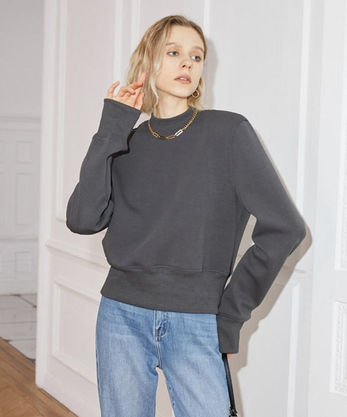 モックネックのクロップドスウェットは、デニムパンツと合わせてカジュアルに、フレアスカートと合わせれば女性らしいバランスの取れたスタイルに。シンプルなデザインで着回しやすく、どんなボトムスとも相性抜群の万能トップスです。
