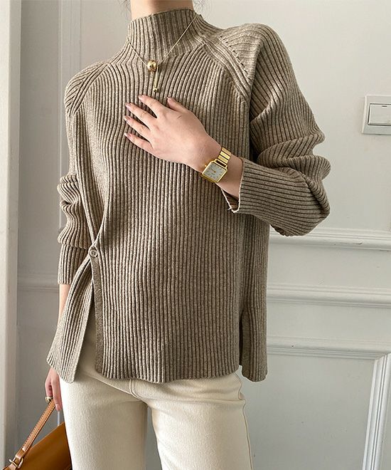 サイドスリット入りのハイネックリブニットは、縦ラインがすっきり見せてくれるデザイン。くすみがかったベージュを選べば、柔らかく落ち着いた印象で、コーデに季節感と上品さをプラスできます。シンプルながらもこなれ感のある、大人のデイリーコーデにぴったりの一枚です。