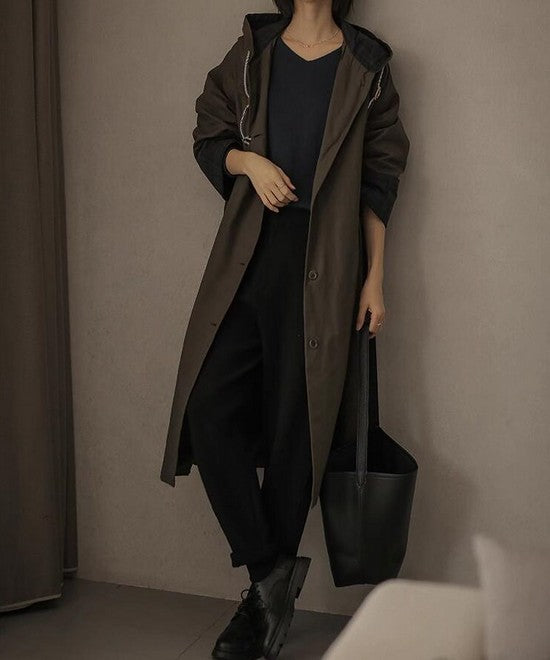 オリーブグリーンのロングコートは、カジュアルでシンプルなデザインが魅力。コットン混素材で程よい軽さがあり、デイリーコーデに取り入れやすい一枚です。どんなスタイルにも馴染みやすく、季節の変わり目の頼れるアウターとして活躍します。