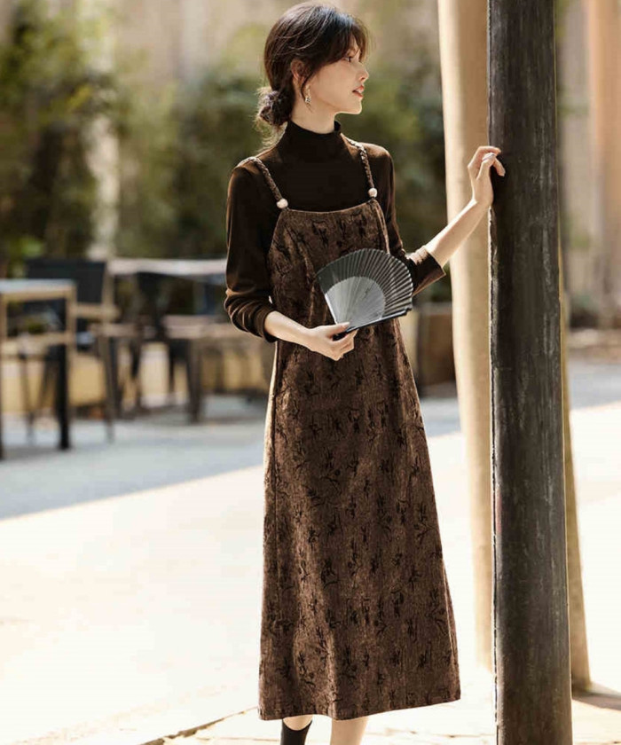 ブラウンをベースにしたプリントは、大人が取り入れやすい“シックな華やかさ”が魅力。重くなりやすい秋冬コーデに軽やかな動きをプラスしつつ、落ち着いた色味で上品さも確保できます。インナーにタートルを入れたり、カーディガンを羽織ったりするだけで季節感も調整可能。華やぎが欲しい日のおしゃれに最適です。