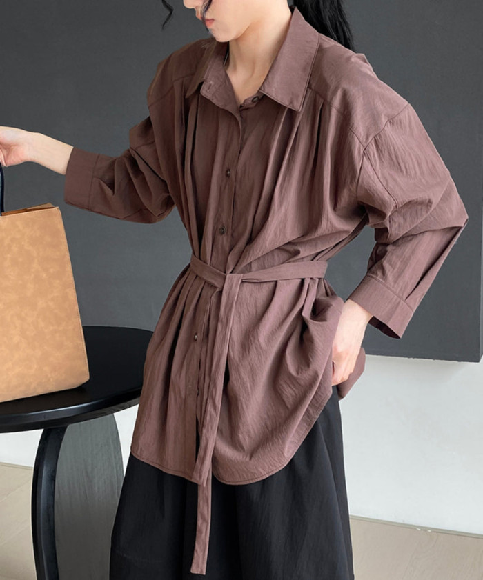 たっぷりの布量を折りたたみ、複数のタックを作り立体感を持たせて、スマートに見せつつも実は体型カバーをしてくれるタックシャツ。深みのあるブラウンの色味がモダンでおしゃれな雰囲気を醸し出してくれるのです。ウエストに共布で作られたベルトを巻けば、さらに大人っぽいこなれスタイルの完成です。