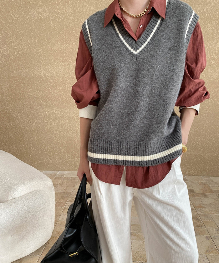 学生を想起させるようなプレッピーなテイストが特徴的な、ライン入りのニットベスト。グレー地×ホワイトのラインが、定番色で大人っぽいのに顔周りをよりフレッシュに若々しく見せてくれます。簡単にプラスワンしやすいアイテムであり、定番的な色味なので何にでもよく馴染み着回しもきくのです。
