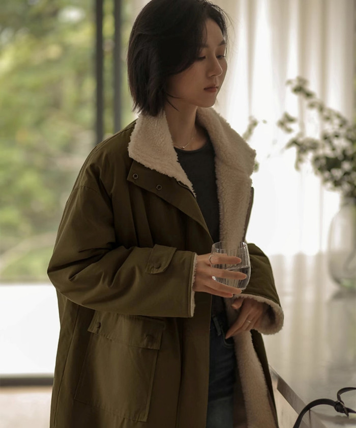 程よいミリタリー感が加わることで、カジュアルなのに幼く見えないバランスが取れた一枚。暖かいボア素材が季節感を引き寄せつつ、デイリーで着回しやすい万能アウターです。スキニーパンツやワイドパンツ、スカートにもマッチし、どのスタイルにも自然になじむ包容力の高さが魅力。いつもの服に“ちょい辛口”要素を足したい大人にぴったり。
