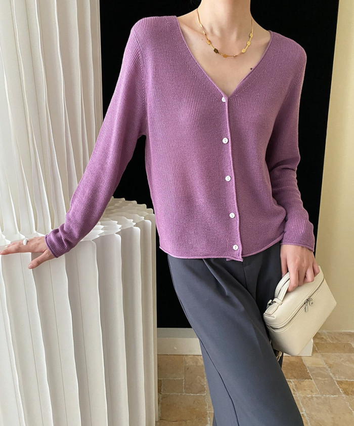 今季のトレンドカラーであるパープルカラーを全面に打ち出し、トレンディーでありつつも好印象にしてくれるシンプルなカーディガン。Vネックの襟デザインが、デコルテを綺麗にすっきり見せてくれます。トレンディーですっきり見えするいいとこどりなデザインは、シンプルなデザインだからこそ成り立つのです。