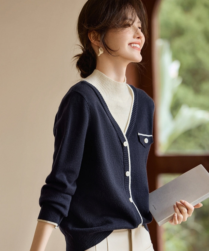 カーディガンとインナーがドッキングしたツーピース風なニット。ネイビー×ホワイトの定番的なコントラスト配色なので、シンプルなのに地味見えすることなく高級感を演出してくれます。コントラストを強くするセンターラインが、タートルネックでもスマートですっきり見せてくれるポイントなのです。