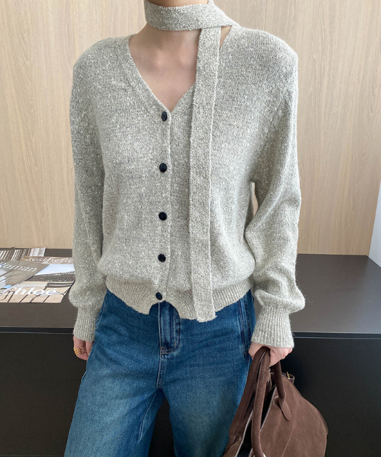 気温差の激しいこの頃、ジャケットとシャツの間に挟めるこんなシンプルなカーディガンがあると安心。さらには体温調節だけでなく、1枚でもお洒落に着られれば嬉しいですよね。こちらはミックス糸を使ってワンランク上の仕上がりに。揃いのタイも効いています。