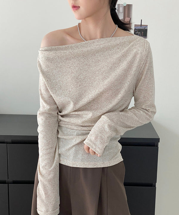 アプリコットカラーのオフショルダードレープニット。ウエスト周りのドレープデザインと、袖丈長めのシルエットが上半身を華奢に魅せてくれます。ブラウンやカーキなど、アースカラーのアイテムと相性抜群です。