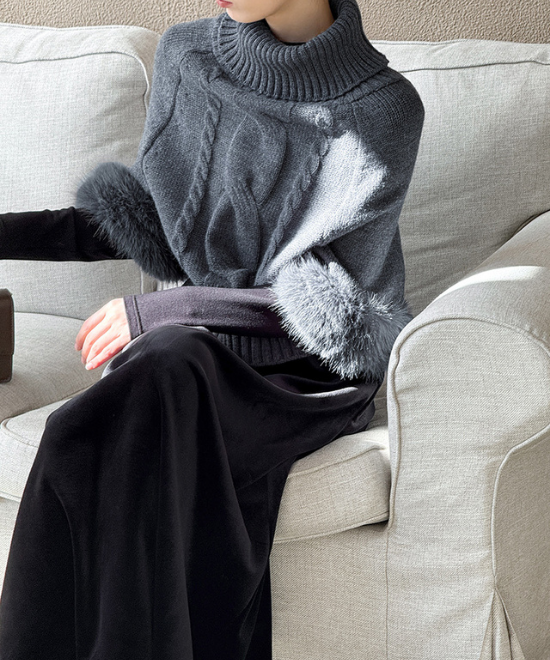 ファーの華やかさとケーブル模様のトラッド感が絶妙にマッチ。
