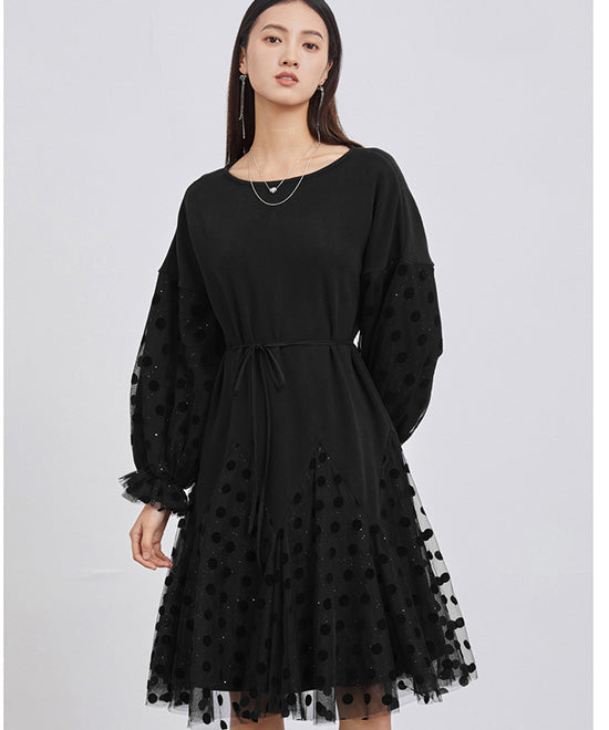 チュールに浮かぶ水玉がロマンティック。袖や裾の透け感が上品で、ブラックの引き締め効果と絶妙なバランス。ヒールブーツやクラシカルなバッグと合わせて、ちょっとしたお出かけにもぴったりです。