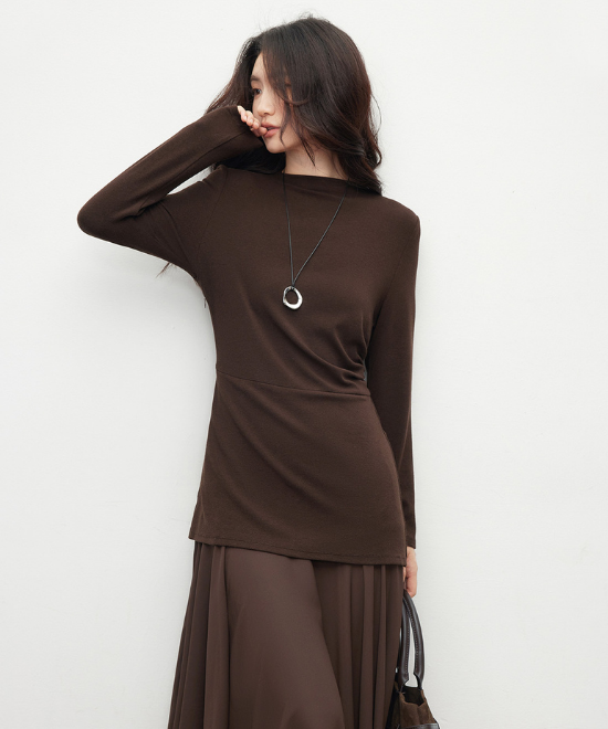 フェイクツーピースで着るだけでコーデが整う便利なワンピース。ベロア素材の優しい光沢が高級感を生み、プリーツスリーブが腕まわりを美しく見せてくれます。ゆったり着られるのにきちんと華やかで、冬のお出かけにぴったりの一着です。