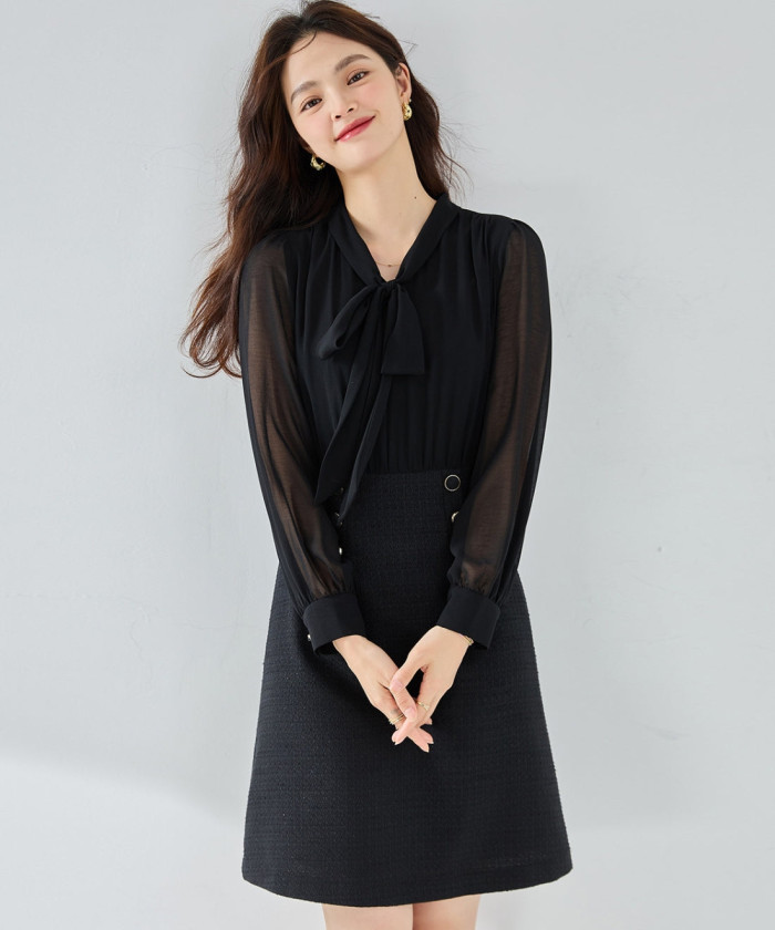 ブラウスとワンピースを重ねたようなデザインなのに、一枚でさらっと着られる便利さが魅力。首元のボウタイがアクセントとなり、クラシカルで上品な印象に。忙しい朝でも仕上がったコーデに見える“頼れるワンピ”です。