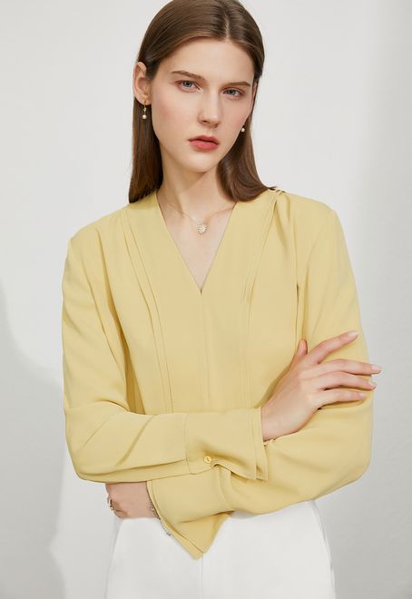 「シンプルだけど何か違う」そんな印象を作れるのが、深みカラーのブラウス。デコルテをきれいに見せるVラインで顔まわりがすっきり。控えめなデザインだからこそ色の魅力が引き立ち、大人のムードをさり気なく演出してくれます。パンツにもスカートにも合うから、色物初心者さんも挑戦しやすい一枚。