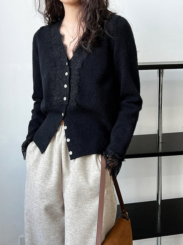 胸元のレースが女性らしさを引き立てるVネックニットカーディガン。ブラックなら甘すぎず上品な印象に仕上がります。スウェットパンツを合わせればラフで抜け感のあるスタイルに、タイトスカートを合わせればきちんと感漂う大人フェミニンに。気分やシーンで雰囲気を変えられる万能アイテムです。