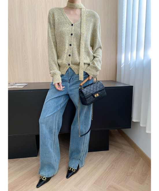 絶妙なカラーミックスが目を惹くニットカーディガン。付属のタイを首に巻くだけで少し特別感ある装いに。深めのVネックラインやブラックのボタンもアクセントになってカジュアルなデニムスタイルも上品な印象に。パンプスやミニマルなバッグを添えるとよりきちんと見えする上品カジュアル。