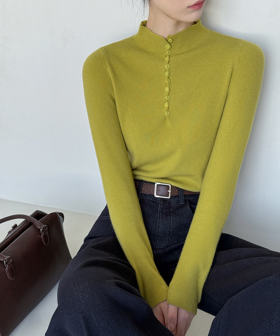 やわらかいウール素材に、首元のボタンディテールがほどよいアクセントになった一枚。締めつけすぎないセミタートルは首元をあたためつつ、顔まわりをすっきりと見せてくれます。シンプルなシルエットでも上品さが漂い、外出にも自宅時間にも使える“気軽できれい”なニットです。