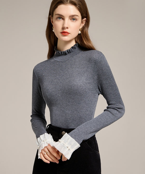 襟元と袖口のフリルが上品に映えるハイネックリブニット。リブの縦ラインがすっきりとした印象を与え、スタイルアップ効果もばっちり。グレーの落ち着いたトーンで、1枚ではもちろん、ジャケットやカーディガンのインナーとしても活躍するきれいめアイテムです。