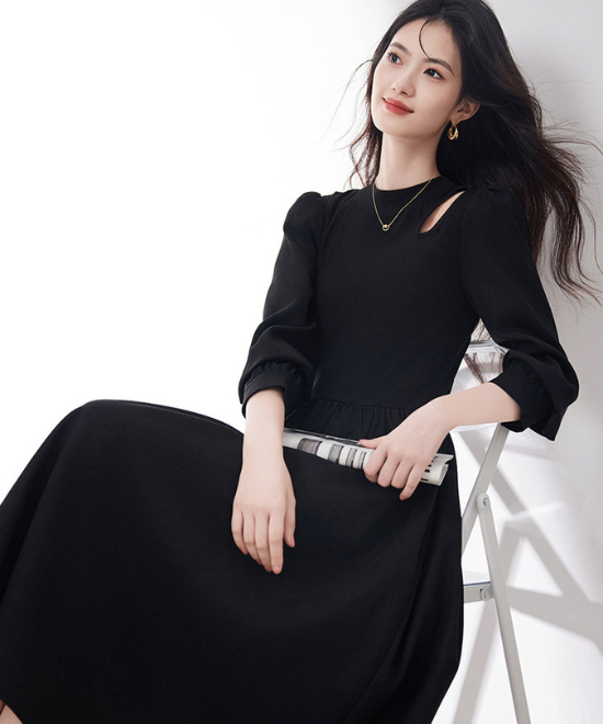 カットアウトがちょっぴりセクシーでふわっと広がる裾がかわいいニットワンピース。ゴールドのアクセサリーを身につけるとエレガントな印象になります。