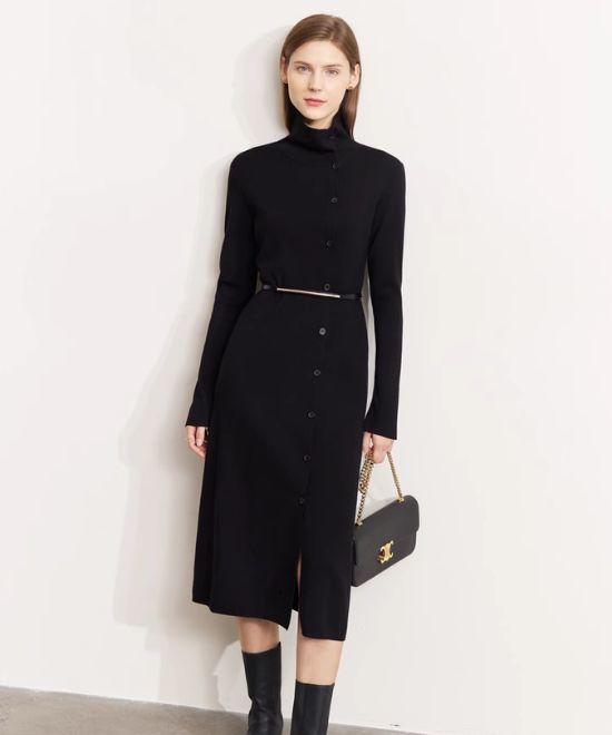 たくさんのボタンとベルトの組み合わせが上品で大人っぽいニットワンピース。スリットが入っているので、セクシーさも演出できます。首元のボタンのつけ外しで印象が変わるのも魅力です。