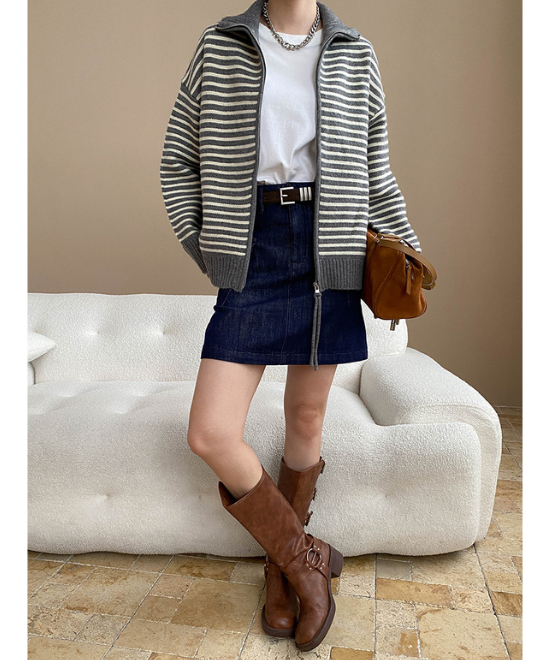 ダブルジッパーのボーダー柄ニットカーディガンは、グレー×ホワイトの配色で爽やかさと大人っぽさを両立。羽織りとしても使えて、ブラウンの小物を合わせれば温かみのある印象に。デニムスカートと合わせて、休日のおしゃれカジュアルコーデが完成します。