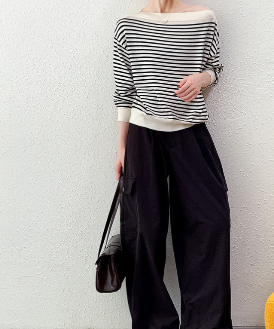 ブラック×ホワイトのボーダーオフショルダーニットは、定番ながら女性らしい肩の肌見せで華やかさをプラス。ブラックのワイドパンツと合わせれば、シックで大人っぽい印象に仕上がり、カジュアルながらもきれいめ感のあるコーデに。デートやお出かけにもぴったりです。