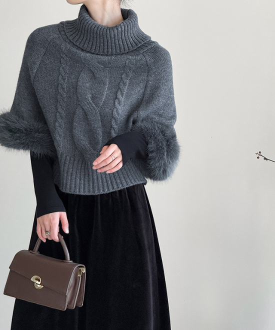 グレーカラーのファー付きニット。ケーブル編みが温かみを演出してくれます。ロングスカートを履いて、秋冬にぴったりのコーデ。