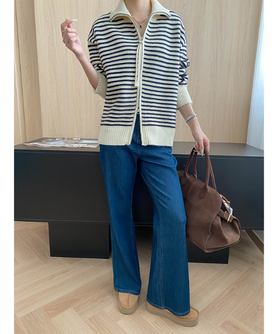 ボーダー柄のニットカーディガン。ダブルジッパーがアクセントになっています。デニムパンツを合わせて、カジュアルに。