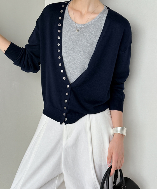 適度なきちんと見えとリラックス感、どちらも叶うのがVネックカーディガンの魅力。シャツやカットソーの上にさらっと羽織るだけで、程よく抜けた大人のカジュアルスタイルに。秋冬の装いを上品に彩ります。