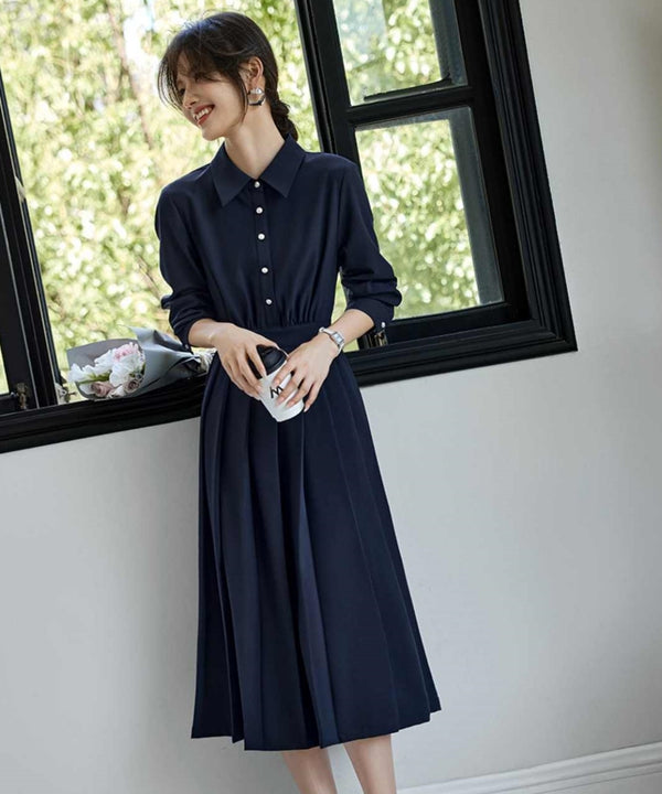 ネイビーのプリーツシャツロングワンピースは、襟付きデザインできちんと感を演出。会議や商談などオフィスシーンでも自信を持って着こなせる、知的で上品な一枚です。プリーツの揺れが女性らしさをプラスし、シンプルなアクセサリーを合わせるだけで、大人のきれいめスタイルが完成します。