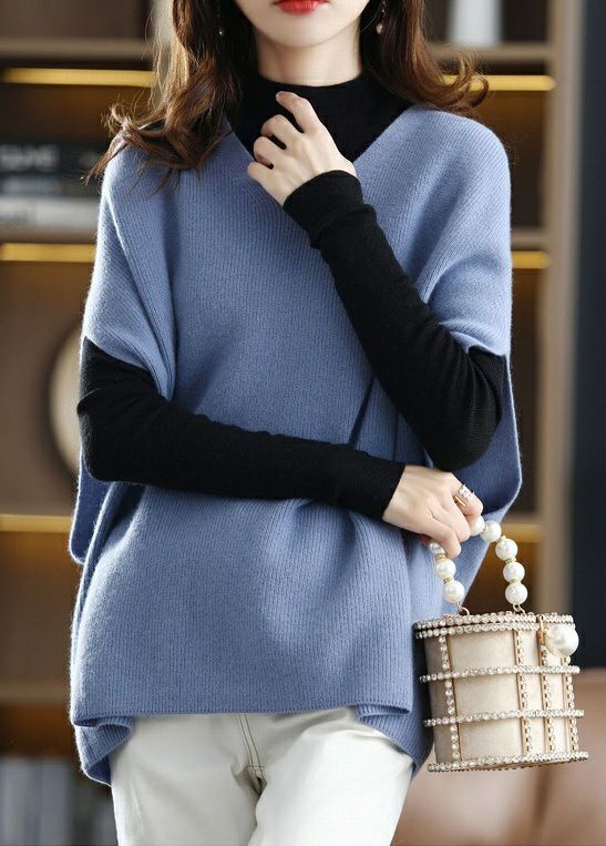 群青色を少し薄めたようなブルーが大人っぽくもあり、また気品が感じられるニットベスト。ゆるっと大きめのサイズ感は大人の余裕を感じさせてくれるだけでなく、厚手のインナーもうまく収めてくれますよ。着回しが効くから、忘年会続きでピンチのお財布にも優しい。